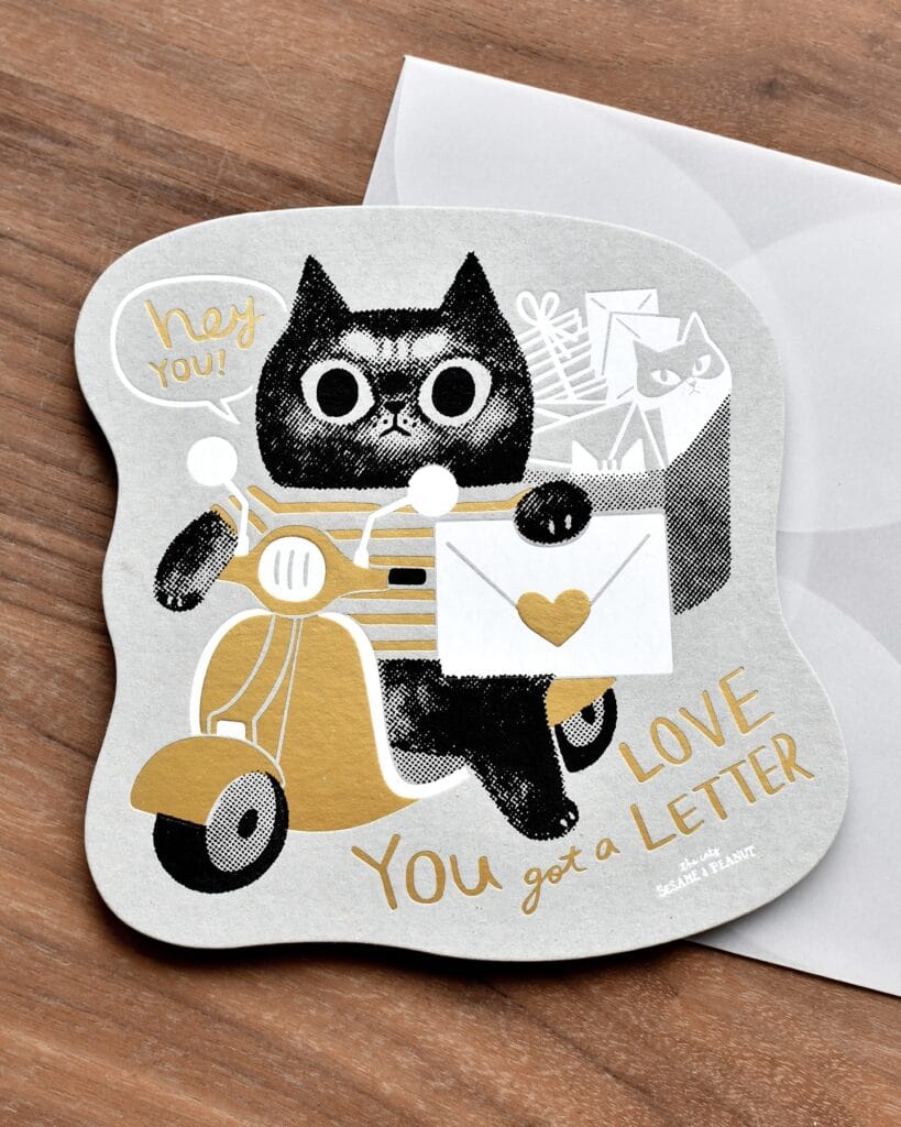 The card is die-cut into a rounded square shape, which already makes it stand out from the flat boring stack of cards at Target. The illustration uses a black halftone print style — that grainy, almost vintage-newspaper texture — layered with gold foil accents on the scooter, the envelope’s heart seal, and the hand-lettered text. The background is a soft warm gray matte cardstock. It feels substantial in your hands, not flimsy.
