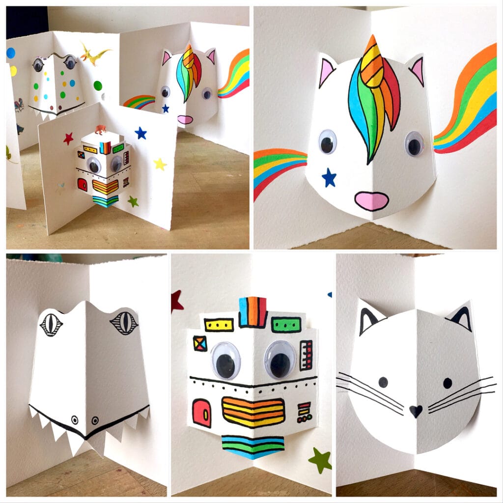 Okay, so you know how every year you’re scrambling to find a birthday card that actually feels special? These fold-out paper character cards are the answer you didn’t know you needed. White cardstock panels fold accordion-style to reveal hand-drawn characters — a unicorn with a rainbow mane, a robot with googly eyes, and a minimalist cat with drawn-on whiskers and a tiny heart nose.