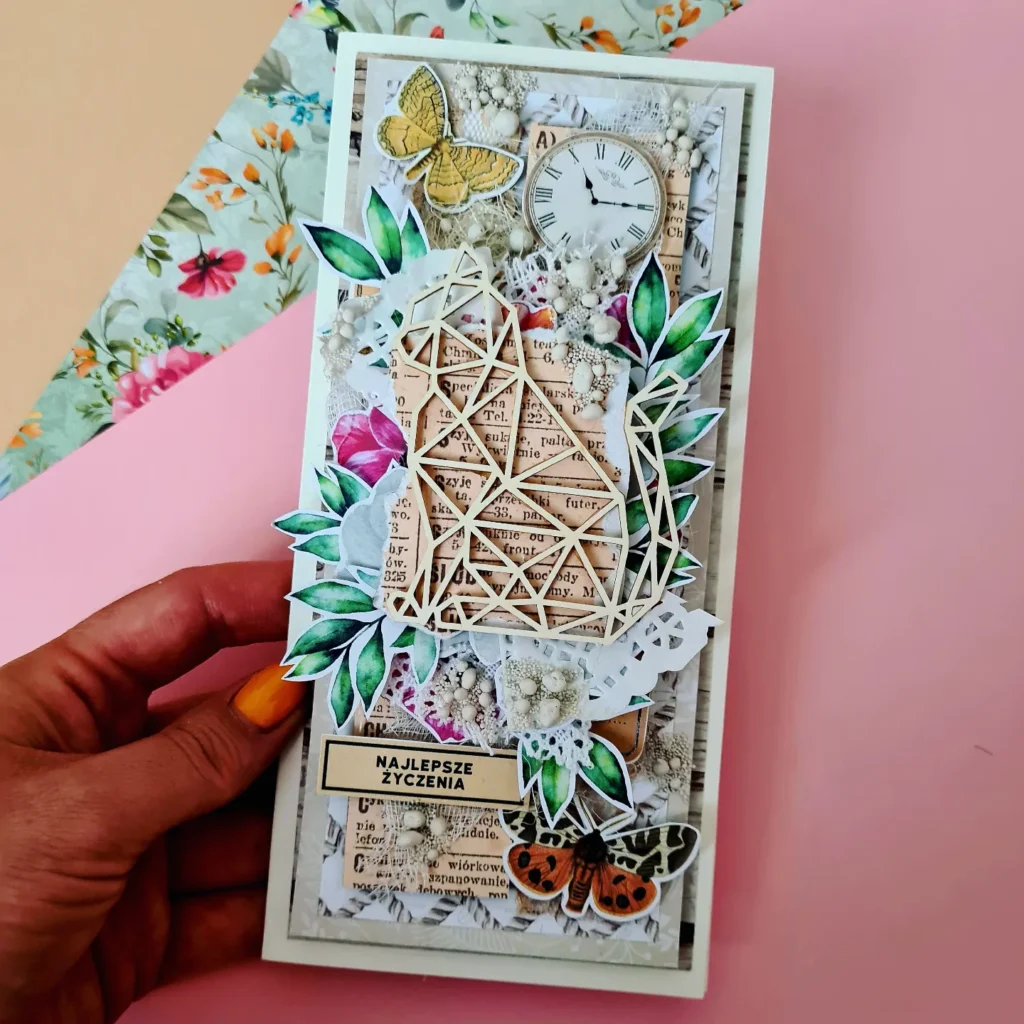 The decorative cutouts are doing a lot of heavy lifting here. There are two butterfly die-cuts (one yellow, one orange-brown), watercolor leaf clusters in deep green, and a pink rose accent. A small Roman numeral clock embellishment sits near the top right. The sentiment tag reads “NAJLEPSZE ŻYCZENIA” (Polish for “Best Wishes”) on a kraft label strip — though you could swap this for any birthday sentiment.