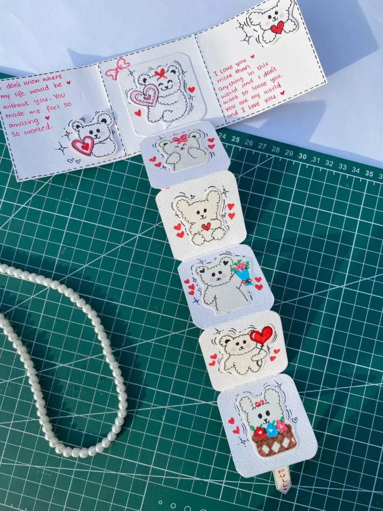 This pull-tab accordion card is genuinely one of the most impressive handmade formats I’ve seen. A hidden strip of illustrated panels tucks inside a folded outer card — and when you pull the tab at the bottom, six tiny bear drawings fan out in a cascade. The whole thing fits inside a standard envelope.