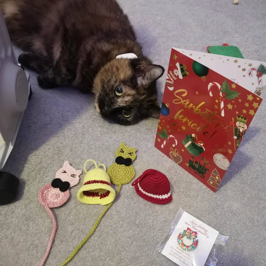 Okay so picture this — you’re scrolling Pinterest looking for something actually thoughtful for your cat-obsessed friend, and you stumble across this. A red and gold foil Christmas card (“Sărbători fericite!” — that’s “Happy Holidays” in Romanian) paired with a full set of handmade crochet cat toys. Not a gift bag from the checkout aisle. A real moment.