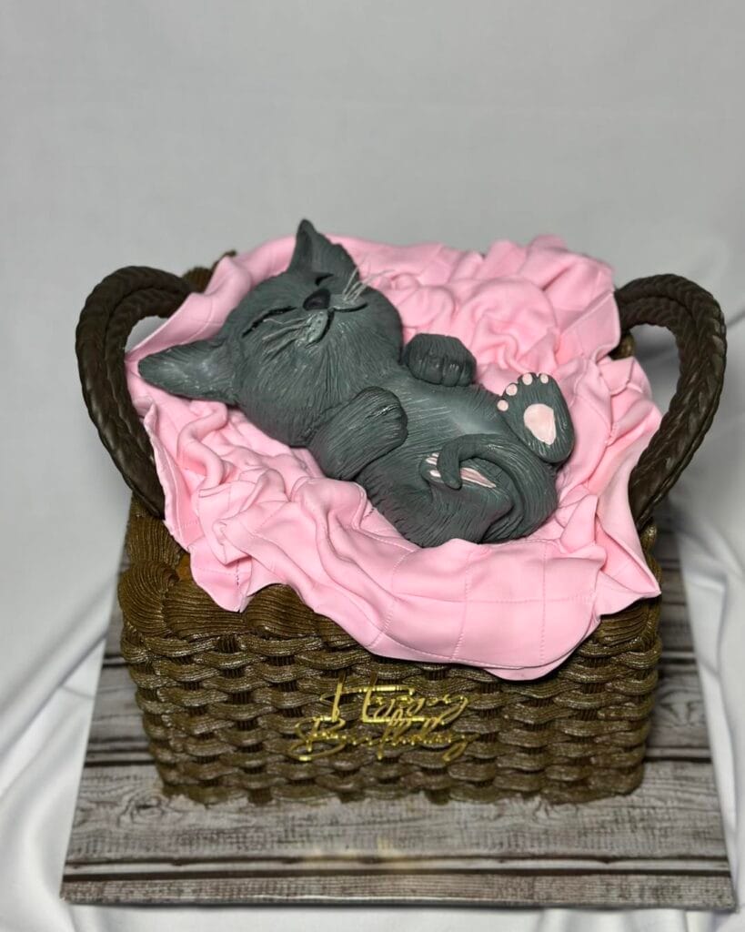 #6: Sleeping Gray Cat in a Wicker Basket Cake Topper — The Most Adorable Birthday Centerpiece You’ll Ever See