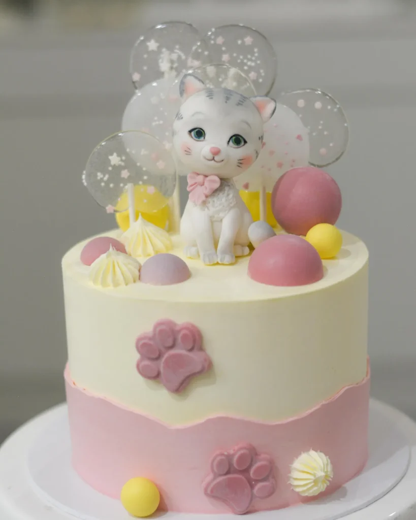To recreate this, you’ll need a two-tier 6-inch cake, Swiss meringue buttercream in cream and blush pink, pre-made isomalt sheets (you can find them on Etsy), and either a polymer clay or fondant kitten figurine — custom ones run about $25–$45 from cake topper shops.