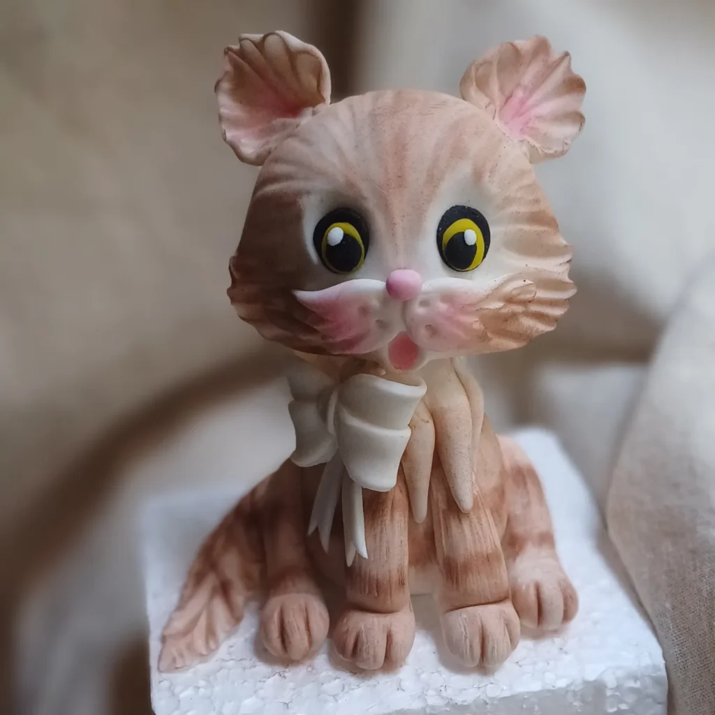 This is a hand-sculpted polymer clay kitten figurine — and honestly, it’s giving full cartoon-come-to-life energy. We’re talking orange tabby striping, painted with warm terracotta and cream tones, big yellow and black cartoon eyes with tiny white highlight dots, and a little white ribbon bow tied right at the chest. It sits on a small white stone or resin base, which makes it so easy to press straight into frosting without it sinking.