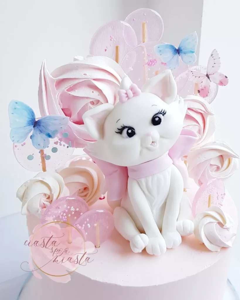 Okay, so picture this — your little one’s birthday is coming up and you want something that stops people mid-bite and makes them grab their phone for a photo. This topper does exactly that. It’s Marie from The Aristocats, sculpted in white fondant, sitting pretty on a blush pink cake surrounded by swirled meringues, isomalt lollipop discs, and delicate butterfly wafer paper decorations.