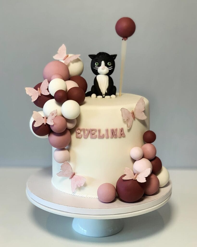 The whole thing is covered in smooth cream fondant, ringed by a cascade of burgundy, dusty rose, and ivory fondant spheres that wrap around the base like a balloon garland — except edible. Scattered between those spheres are these delicate blush pink wafer paper butterflies, and sitting right on top is the star: a hand-sculpted tuxedo cat figurine made from black and white fondant, with tiny green sugar-glass eyes and actual whisker details pressed in.