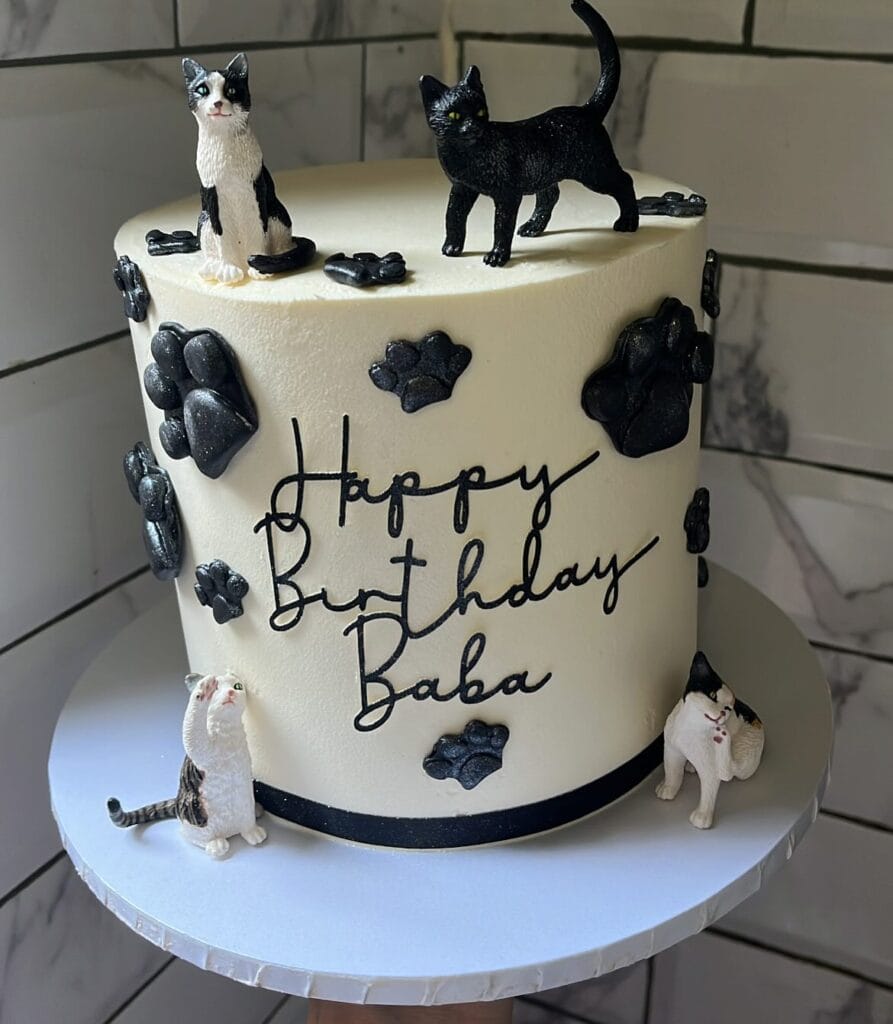 This white buttercream round cake is covered in 3D black fondant paw prints pressed right into the frosting, and it has the most personality I’ve ever seen on a single dessert. The handwritten-style “Happy Birthday Baba” lettering in black piping gel runs down the front in this loose, casual script that feels personal and intentional at the same time.