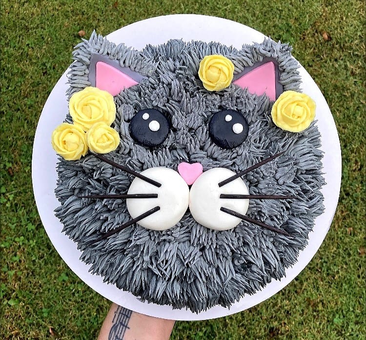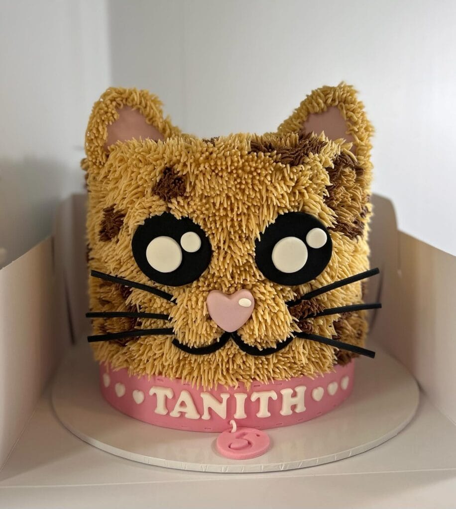 This cake is everything. We’re talking a full cat face sculpted from golden yellow and brown buttercream, piped in a grass-tip technique that mimics actual tabby fur texture. The eyes are made from black and white fondant discs, giving it that wide-eyed cartoon cat look that makes it feel straight off a Pinterest board.