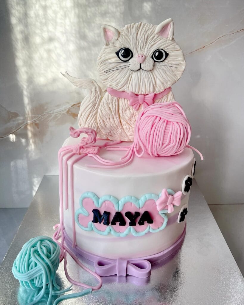 Okay, so picture this — you’re scrolling Pinterest at midnight, coffee going cold, and this cake stops you mid-scroll. A fluffy white kitten sculpted entirely from fondant, sitting pretty on top of a pale pink cake with her little pink bow and a ball of yarn. It’s giving childhood stuffed animal meets high-end bakery, and honestly? I gasped a little when I first saw it.