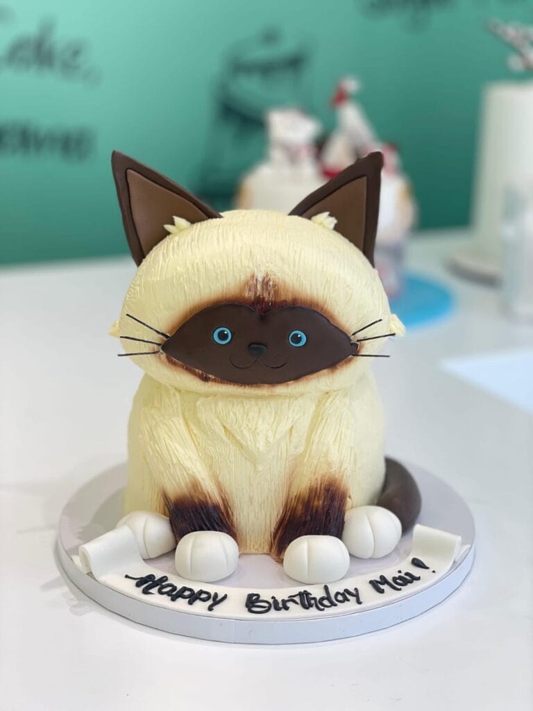 This is a sculpted 3D Siamese cat cake — and it’s giving full fluffy kitten energy. The body is covered in textured buttercream piping that mimics real cat fur, done in that classic Siamese colorway: cream/ivory base with dark chocolate brown at the face mask, ears, paws, and tail tips. The face is made from fondant — a flat, smooth dark brown piece shaped like the classic Siamese facial mask — with those iconic bright blue fondant eyes that honestly look alive.