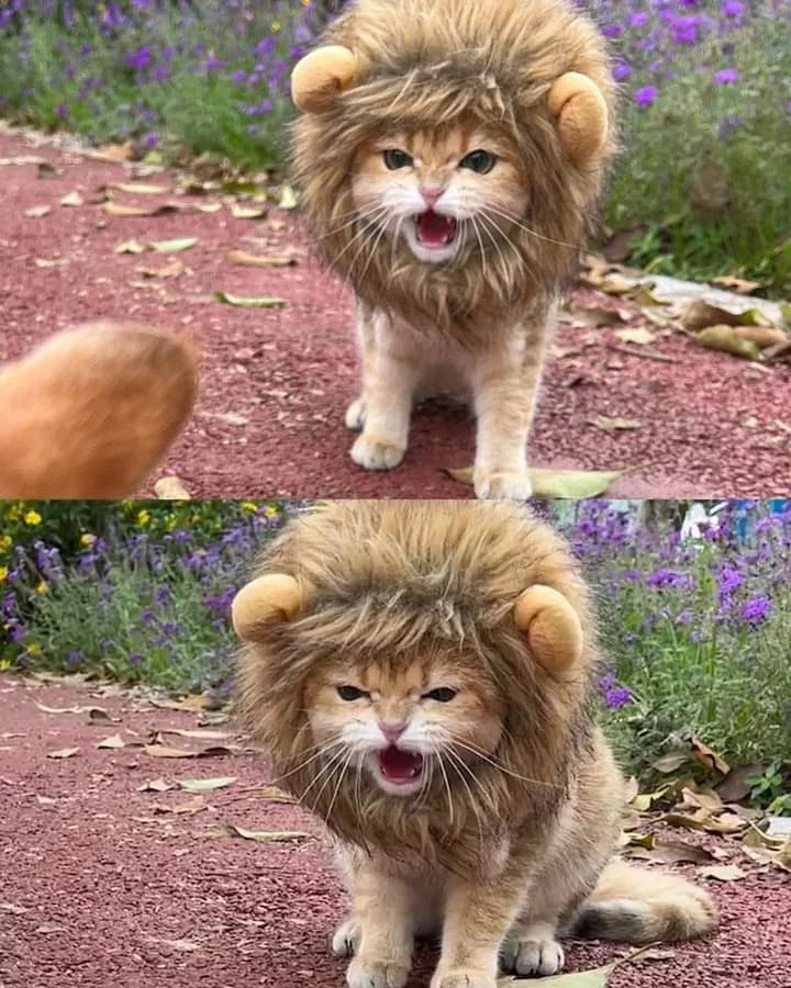 Shoot outdoors against purple wildflowers like these — the contrast against the warm golden tones of the mane is unreal. And if your cat is costume-averse, drape a fleece-lined mane over them for thirty seconds, snap fast, done.