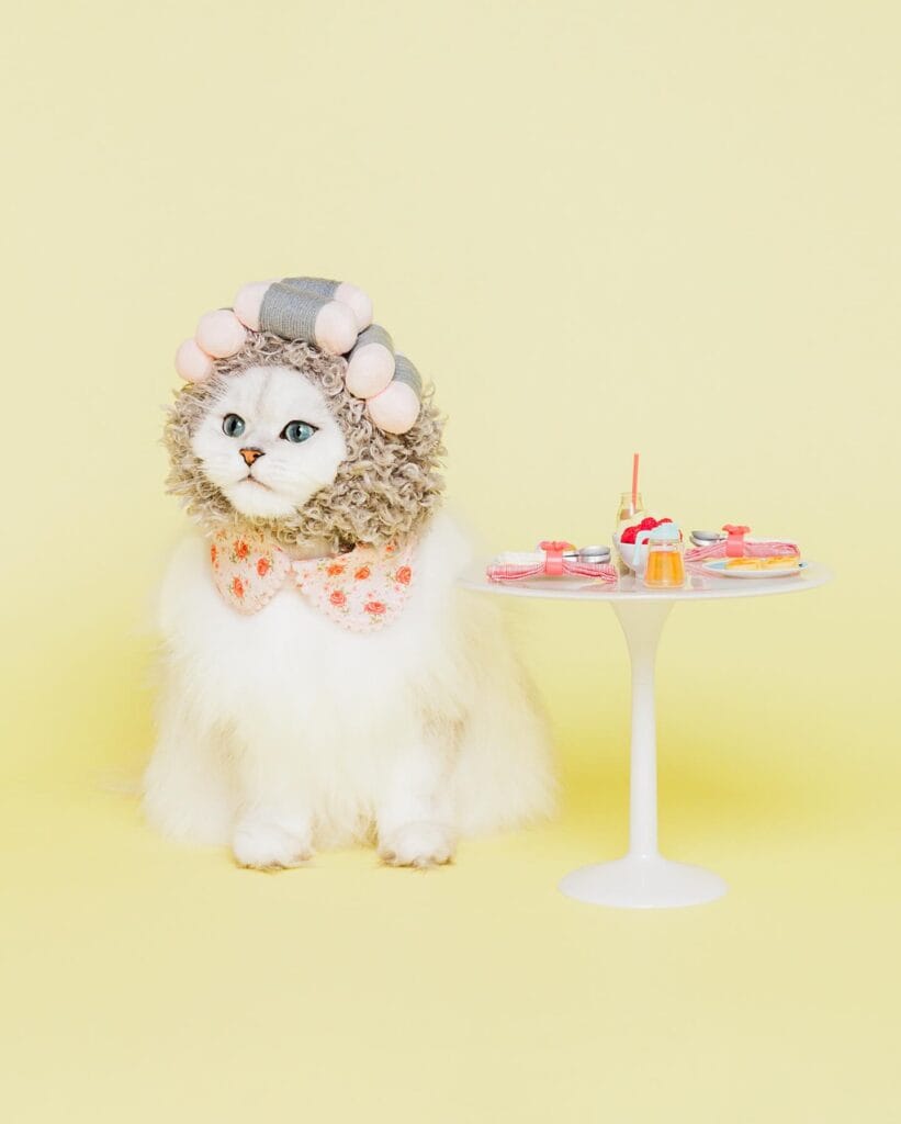 The yellow backdrop and miniature pedestal table styled with tiny food props aren’t just cute staging — they tell a complete story. That table detail? Chef’s kiss. If you’re photographing your cat in this, set a small side table with mini props at cat-eye level to get that same editorial shot.