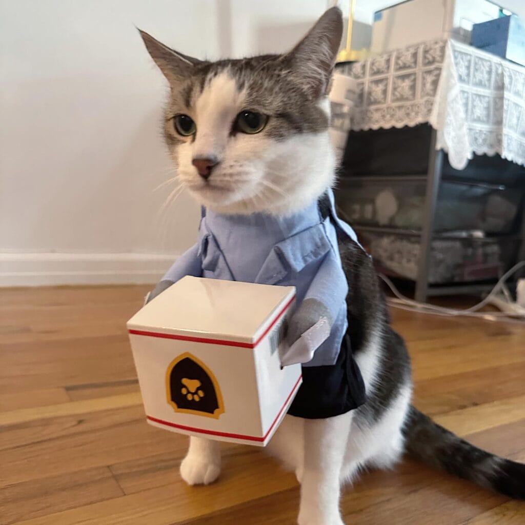 Okay, so you know how your golden does that whole “I must greet the UPS guy like he’s a long-lost family member” thing? Picture that energy — but now your cat is the delivery driver. I literally cackled out loud when I first saw this costume.