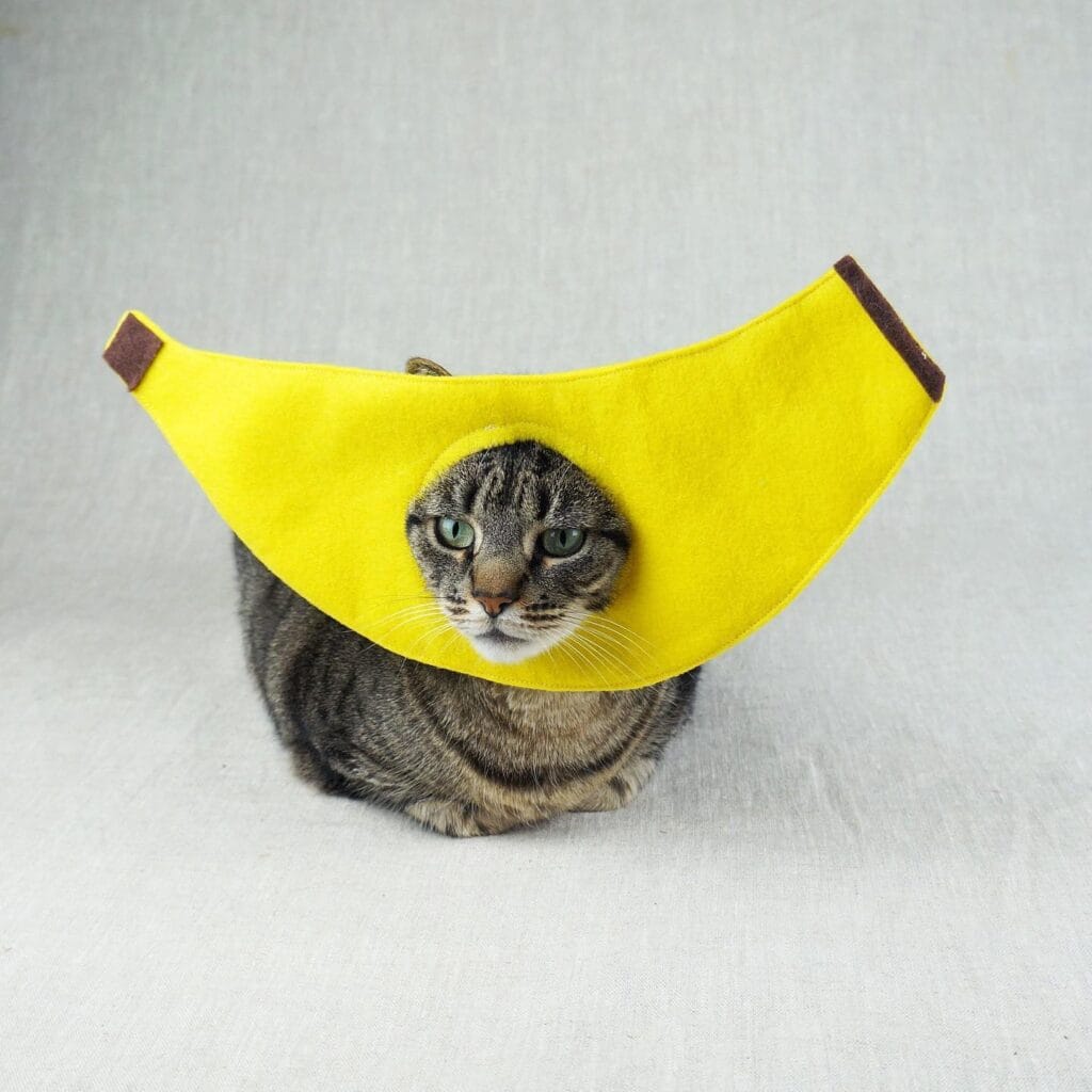 The whole thing sits flat around the cat’s neck like a collar ruff. What makes this work is the stiff felt structure — it holds the banana shape without flopping, so the photo stays clean and sharp. The contrast between the cat’s gray tabby fur and that saturated yellow? Chef’s kiss.