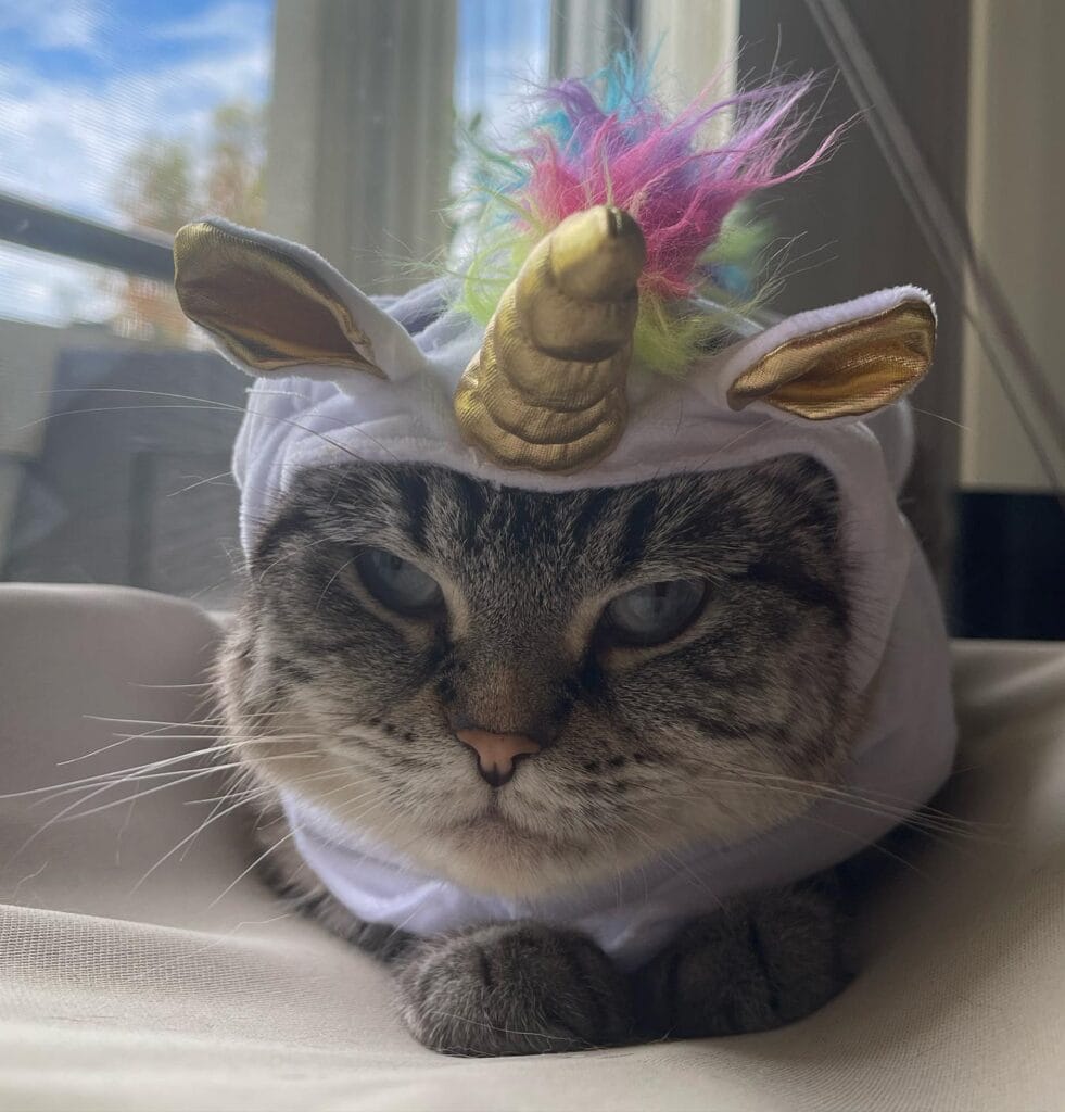 Yeah. Cats are different. And this unicorn costume is proof that some cats will silently judge you while wearing a rainbow mane and a gold spiral horn, and honestly? It’s perfect.