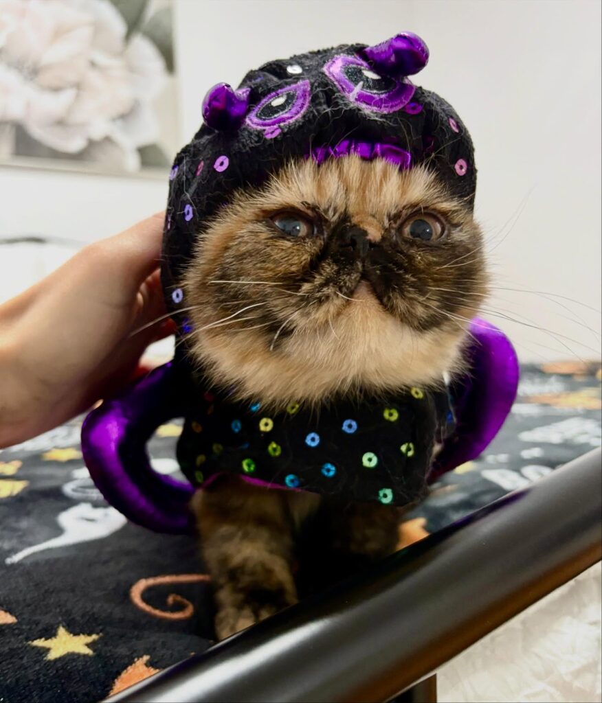 Okay, so you know how your golden gives you that dramatic side-eye when you put a bandana on him? This Persian cat is serving that same energy, but cranked up to a hundred. The black sequined octopus costume wraps around the cat’s body like a little tentacled jumpsuit, with shiny purple stuffed tentacles curling out from both sides. That flat, squished face just makes it — the wide eyes, the permanent scowl — it’s peak Halloween chaos.