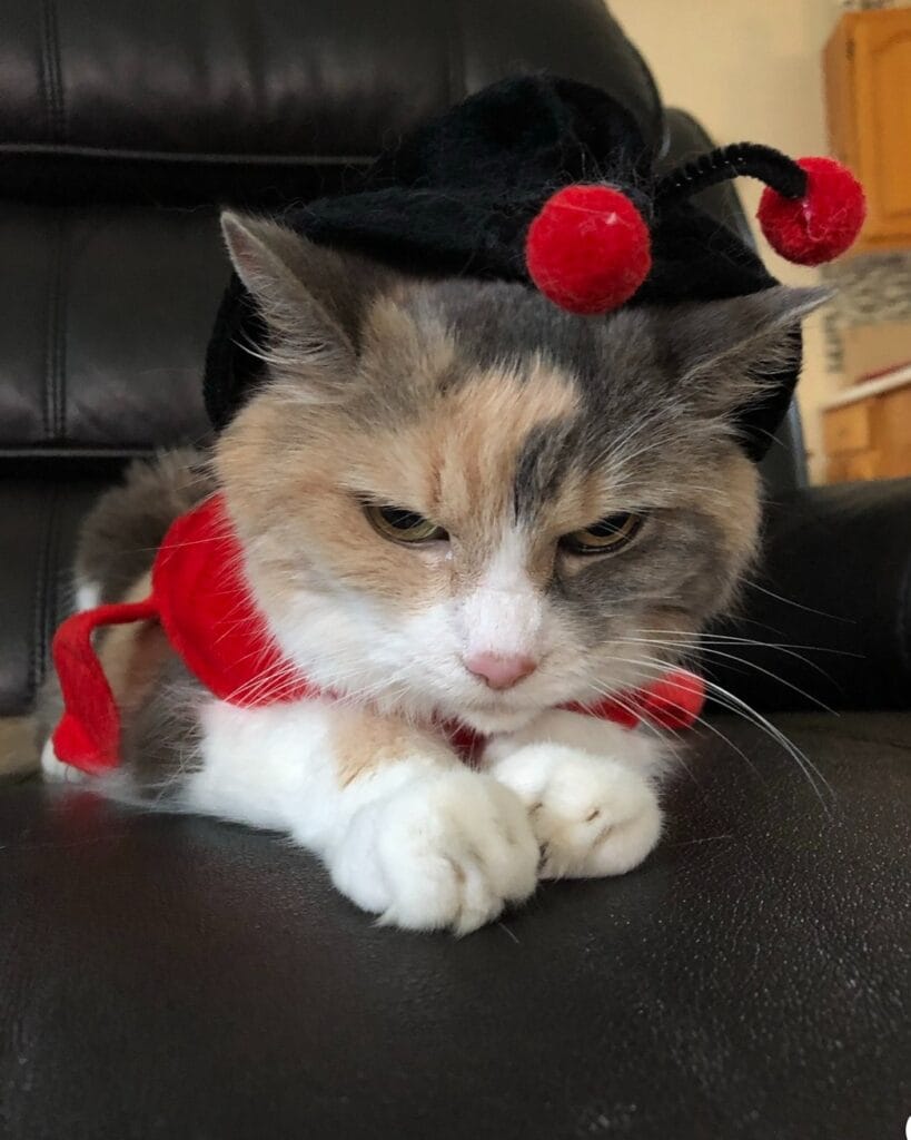 You know how your golden gives you that side-eye when you put a bandana on her? Multiply that by ten. This calico is done with the whole situation, and honestly, she’s never looked more regal doing it.