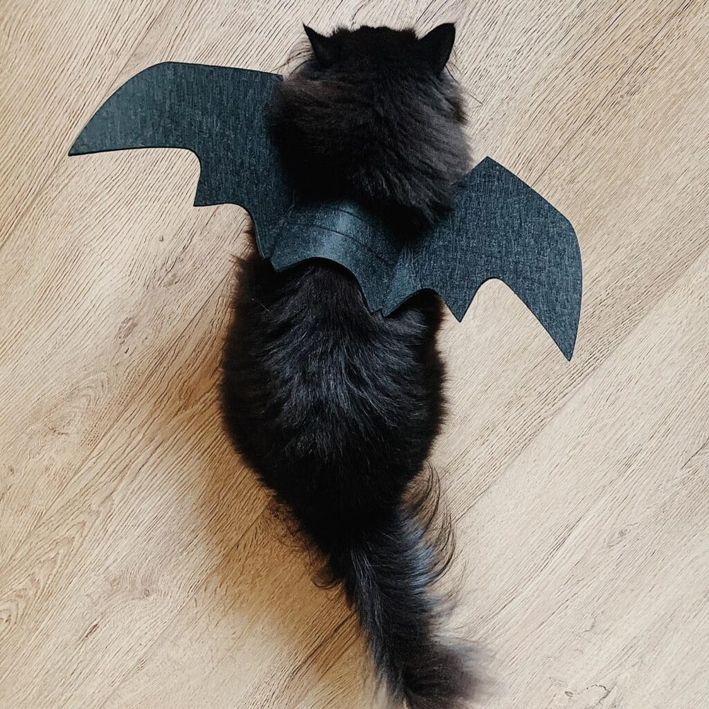 This is a black felt bat wing harness that straps around a cat’s midsection with a velcro or elastic band closure. The wings are cut in a classic bat silhouette with those jagged lower edges, and they sit perfectly flat against the cat’s back — no flopping, no sliding sideways.
