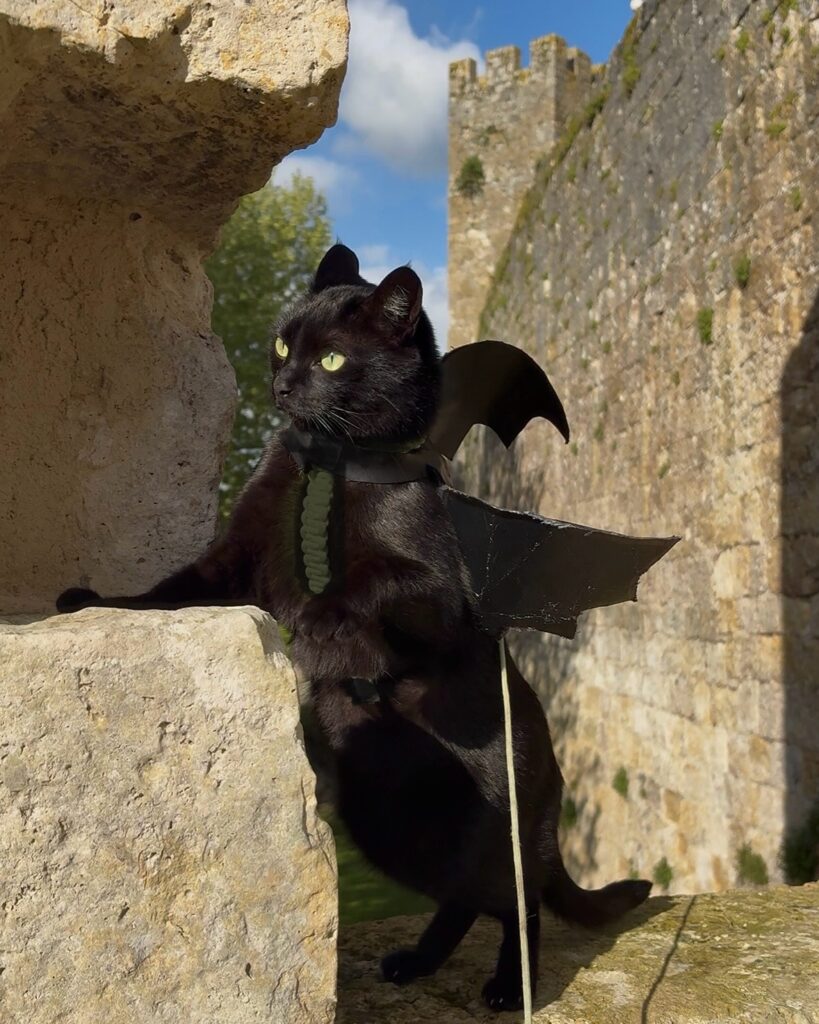 What makes this work so well is the top-down photography angle — it completely hides the harness straps and makes the cat look like an actual bat creature. And because the cat’s fur is black, the wings blend seamlessly… wait, I can’t say that. They blend right in.