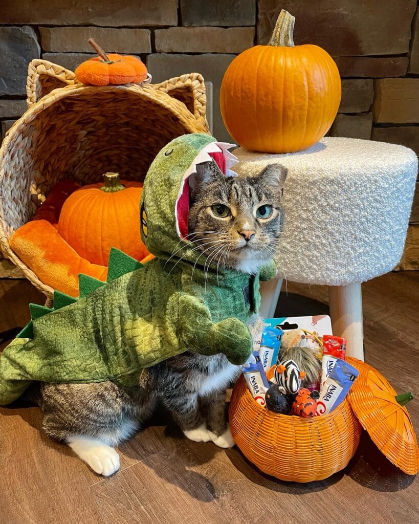 Pair this with a wicker pumpkin-shaped treat basket (like the orange one in the photo) stuffed with INABA cat chews and a few plush Halloween toys. That basket detail — tactile, themed, instantly photo-ready — makes this a full moment, not just a costume.