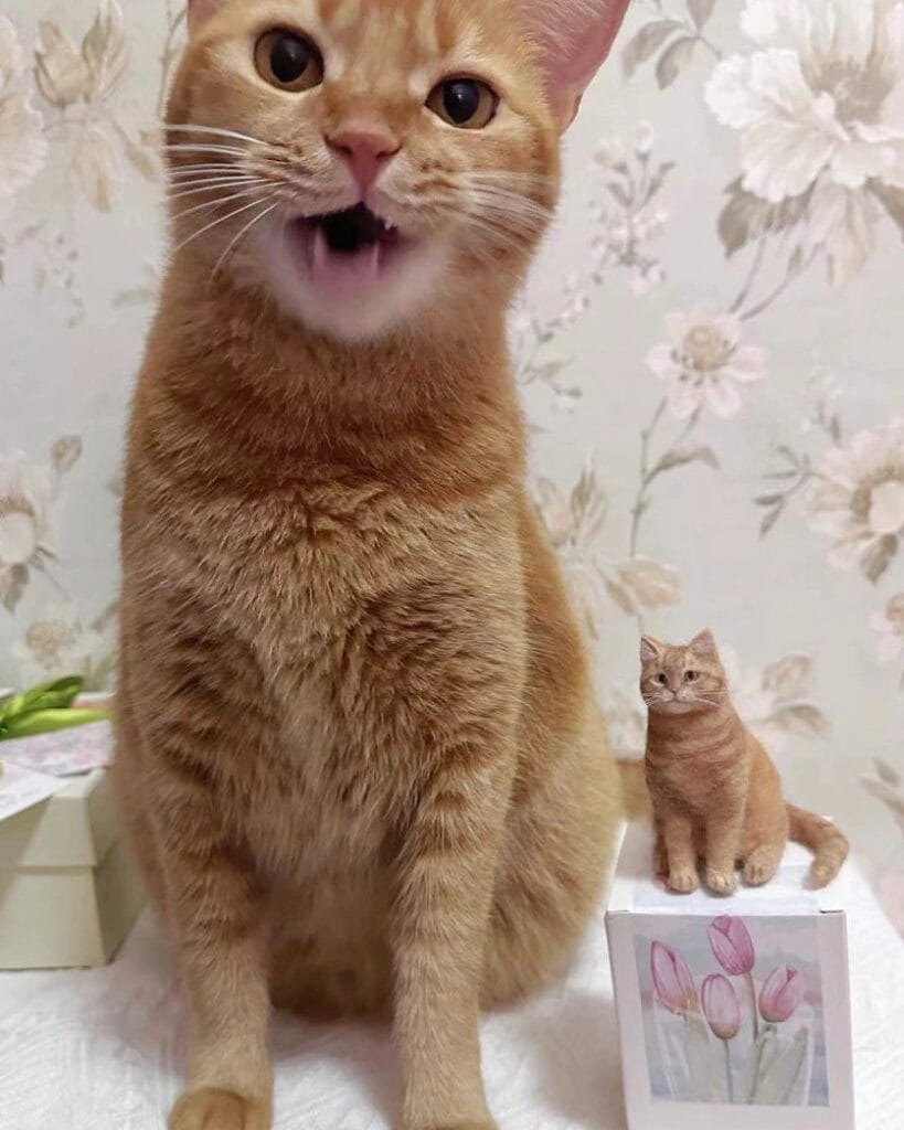 This project recreates your cat as a needle felted miniature figurine, roughly 2-3 inches tall, sitting in a classic upright pose. The one in the photo is a dead ringer for that orange tabby — same striped coat, same little pink nose, same “I own this house” energy.