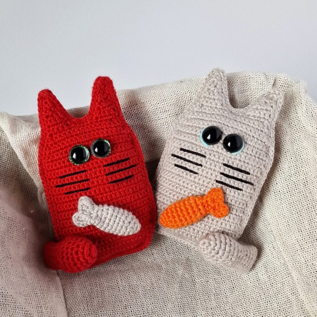 The accessories are what make these irresistible. The bone (for the red cat) is two small circles connected by a short chain, all in beige yarn. The orange fish shape uses simple increases and decreases over 8 rows, with a small split tail. Both get sewn onto the front of the body, centered low, like the cats are proudly holding their little trophies.