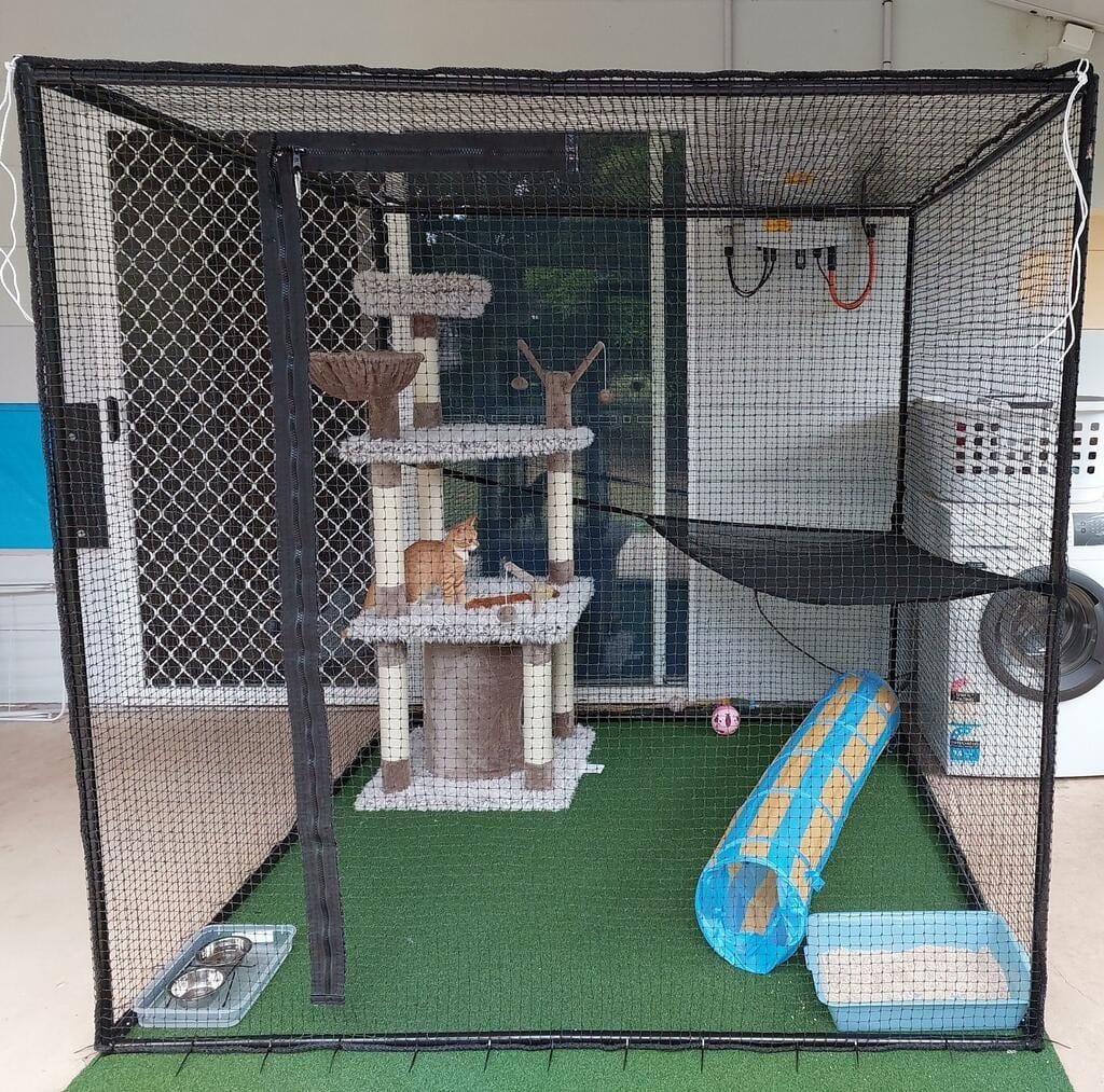 Connect the catio to your home through an existing window or small cat flap cut into the netting. Reinforce that access point with a zippered panel — just like the one visible on the left side of this build — so you can get in for cleaning without dismantling anything.