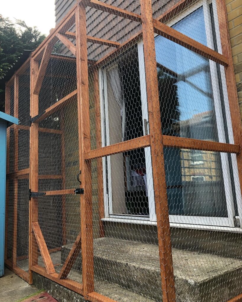 My neighbor did this last summer and I literally could not stop staring at it every time I walked past her place. She took what looked like a boring side entrance and turned it into this gorgeous, tall wood-and-wire outdoor enclosure that connects right to her window. No more door-dashing escape attempts. No more “where is the cat” panic.