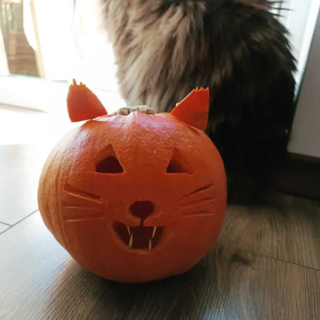 Someone carved their pumpkin to look like a cat — pointy ears cut from the pumpkin skin and propped right on top, whisker lines etched into the sides, a little triangle nose, and actual fangs in the smile. And their real fluffy cat is just… sitting behind it like they posed together. The whole thing is giving Halloween magic.