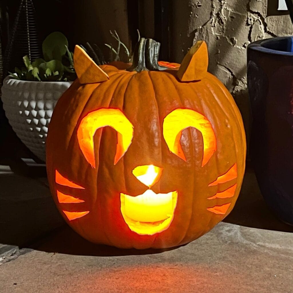 Also — and this is huge — chill your pumpkin in the fridge overnight before carving. Firm flesh carves cleaner. Your cat’s details will stay crisp for days longer.