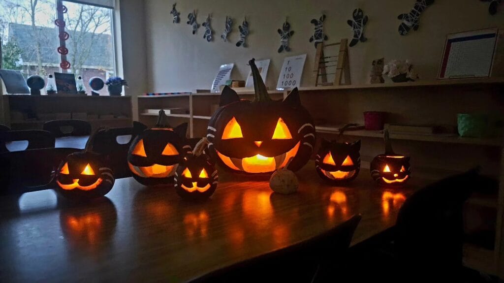 Okay, so picture this — you walk into a dimly lit classroom right before Halloween, and there’s this whole family of glowing cat-face pumpkins lined up on a long wooden table. The warm orange light bounces off the wood surface, and the mummy decorations dangling on the wall behind them just make the whole thing feel like a spooky little dream. Honestly, if your golden retriever wandered in here, she’d lose her mind sniffing every single one.
