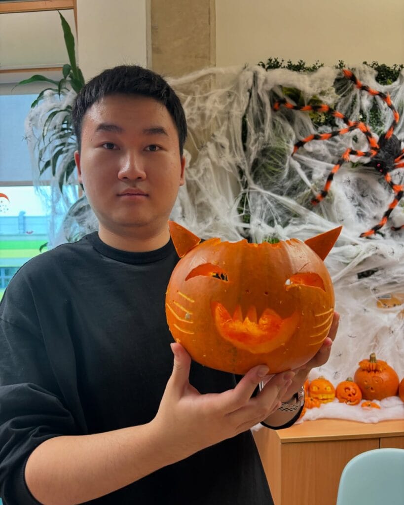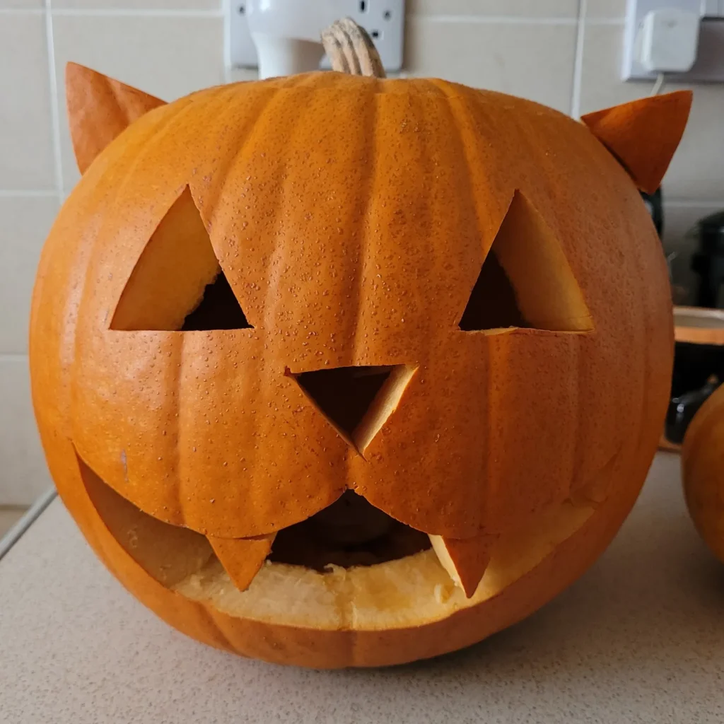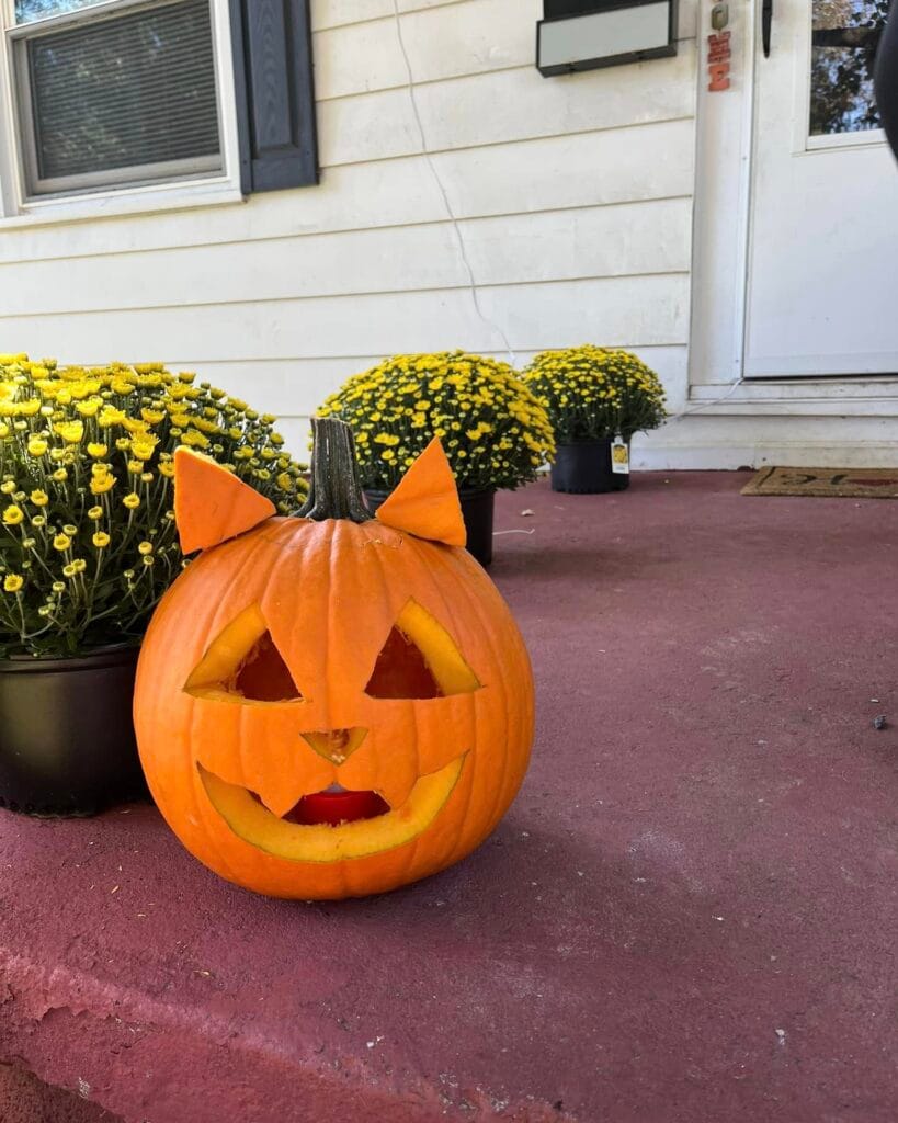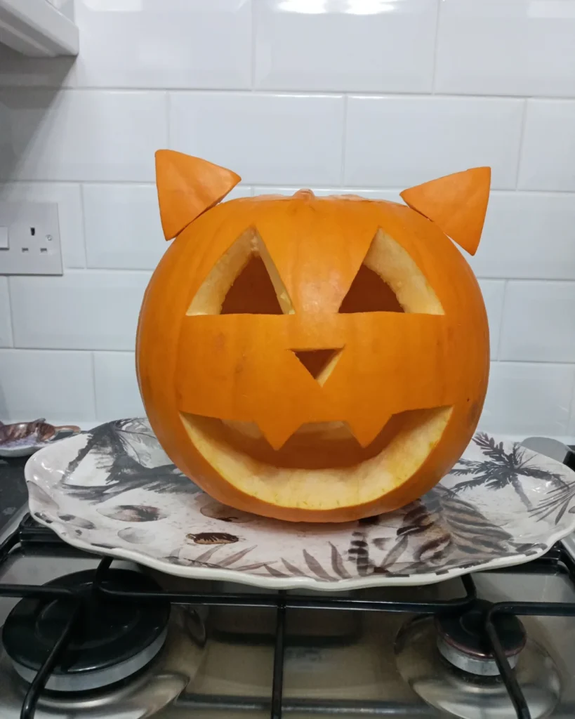 Okay, so this one genuinely stopped me mid-scroll. Someone carved their pumpkin to look like a cat — complete with little pointed ears cut right into the top, slanted angry eyes, and scratched-in whiskers on the cheeks. It’s giving Halloween black cat energy, and honestly? It’s so much cuter than your standard triangle-eye situation.