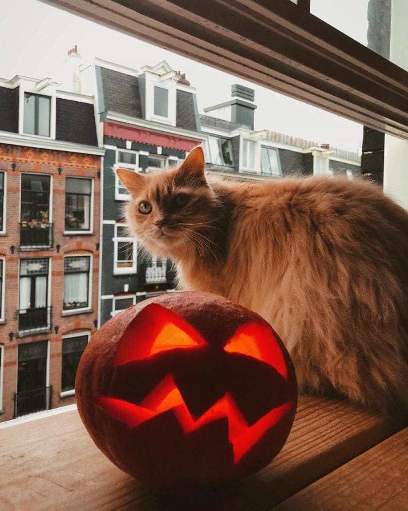 The windowsill here does all the heavy lifting. A wide wooden ledge, roughly 8–10 inches deep, gives both the pumpkin and the cat enough room to coexist without a disaster. The backdrop — those dark Dutch canal house facades — adds serious drama, but even a plain window works.
