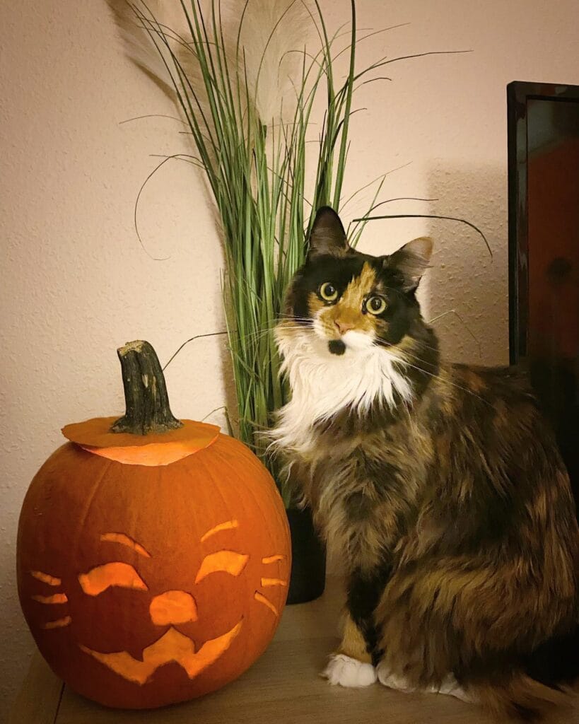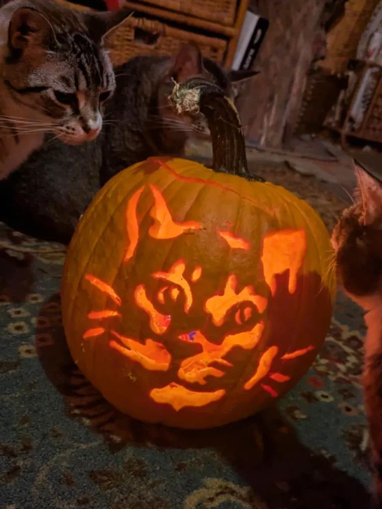 This jack-o’-lantern has cat face features carved directly into the pumpkin — whisker lines, arched brows, a little smirk — and it’s glowing from the inside with warm candlelight. And the real kicker? The tortoiseshell cat sitting right next to it looks like the literal inspiration for the design.