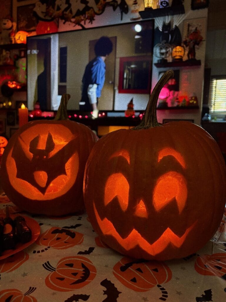 Okay, so picture this — it’s Halloween night, you’ve got a spooky movie playing on the TV, your golden retriever is curled up on the couch next to you, and these two glowing pumpkins are sitting right on your table. That warm amber light flickering through the carved faces? Chef’s kiss. This setup from @veemarhalloween is giving full cozy-Halloween-obsessed-household energy, and I’m here for every single detail.