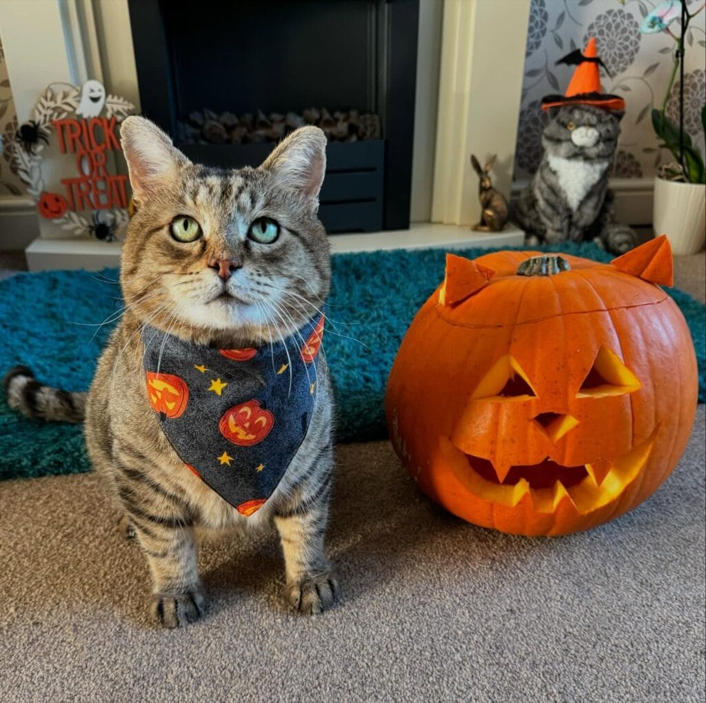 This setup is everything — a tabby cat in a navy blue Halloween bandana printed with jack-o’-lanterns and gold stars, sitting next to a carved pumpkin that’s been turned into a cat face. And not just any cat face. The pumpkin has two small triangular ears cut from the lid, jagged triangle eyes, a tiny nose cutout, and a wide zigzag mouth. In the background, a second cat wears a miniature orange witch hat, sitting near a fireplace with a “Trick or Treat” sign. The whole room gives cozy Halloween living room energy your Pinterest board is going to love.