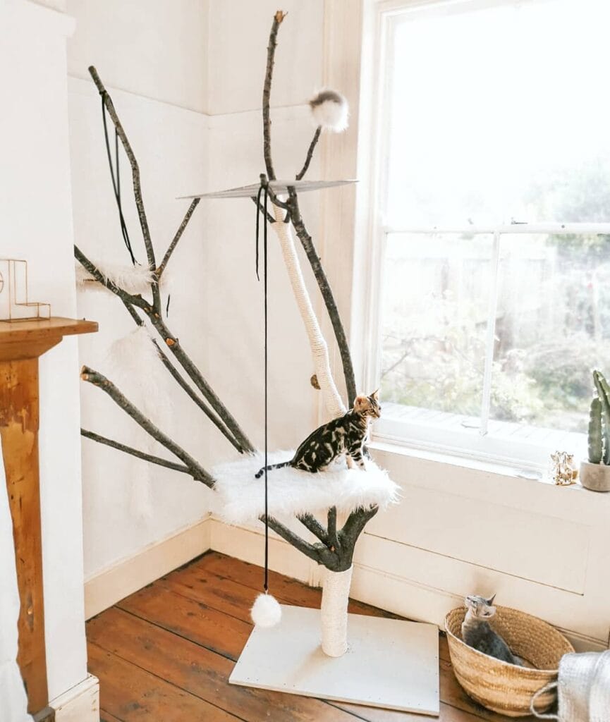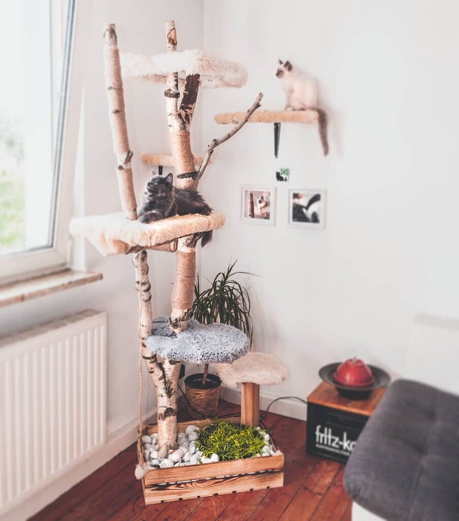 This build is genuinely one of my favorites I’ve come across. It uses real birch branches, a sisal rope-wrapped center post, and white faux fur platform inserts to create something that looks straight out of a Pinterest board — not a pet store.