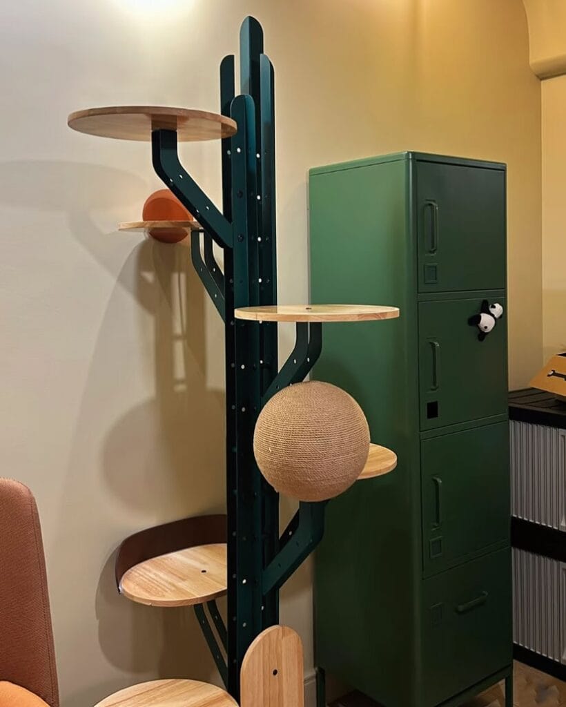 The forest green frame color coordinates with the green metal locker cabinet in the background of the original image, which tells me whoever built this thought about the whole room. Matching your cat tree to existing furniture tones makes it feel like intentional decor, not an eyesore you’re hiding in the corner.