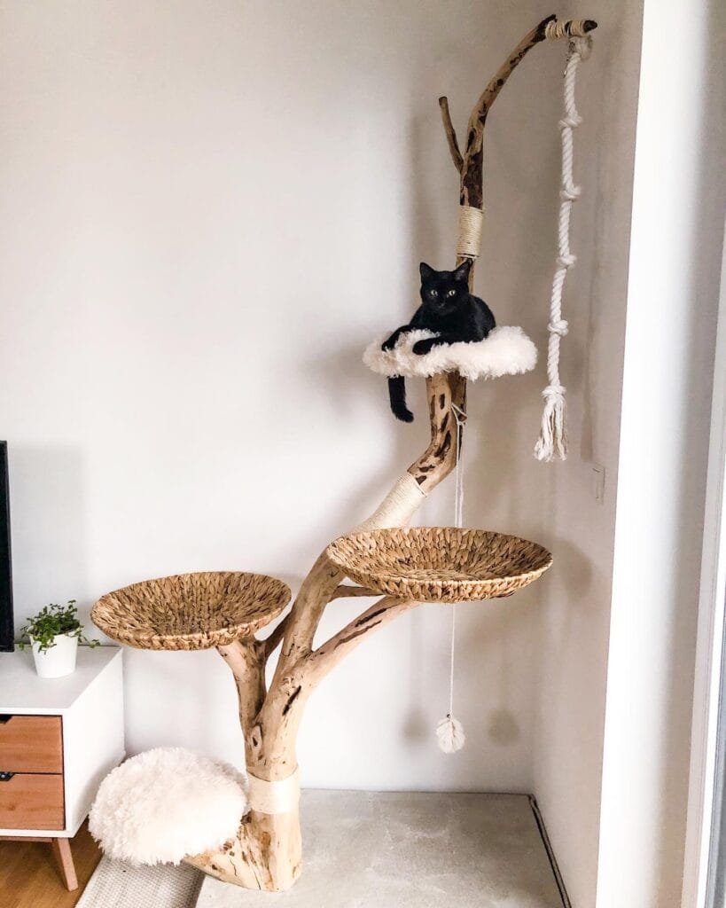 #4: Driftwood Cat Tree With Woven Baskets and a Rope Swing