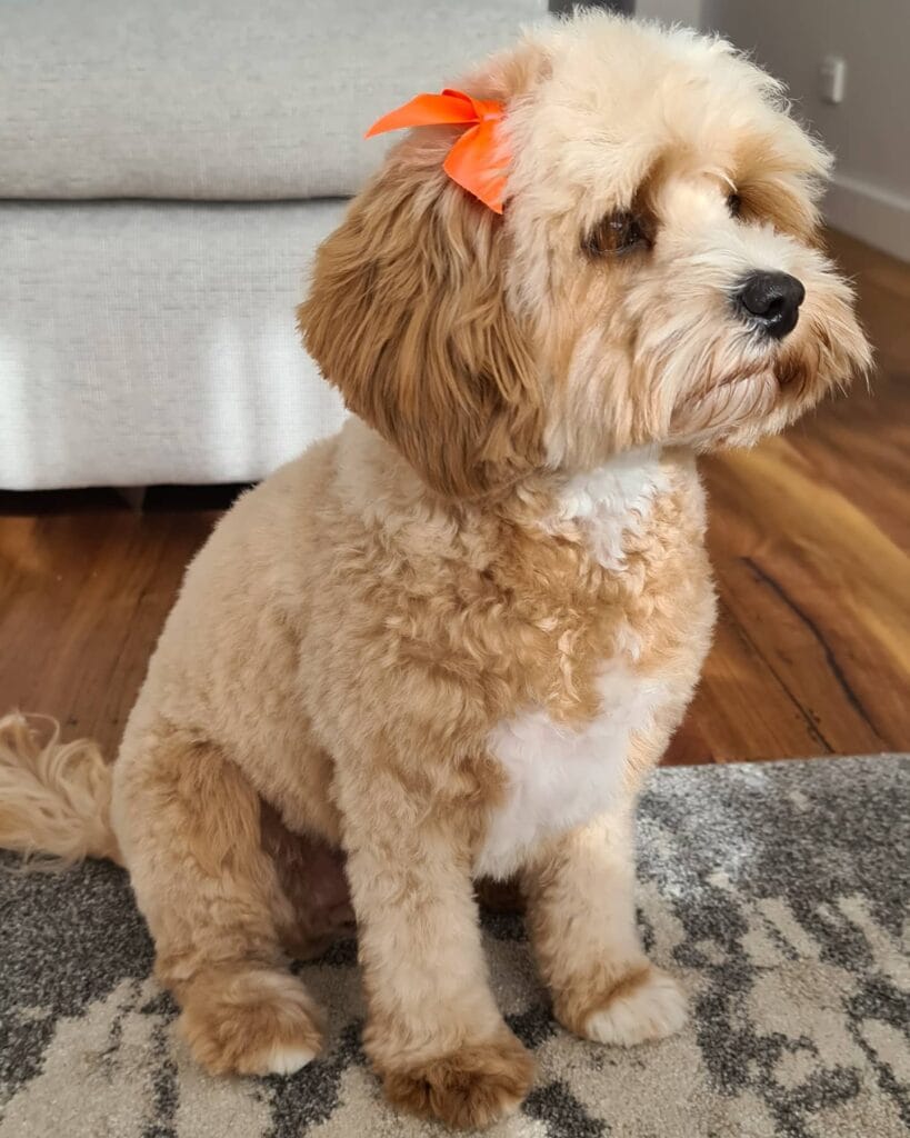 See that golden-cream fluff in the photo? That’s a textbook Puppy Cut on a apricot and cream cavapoo. The body stays neat and curly, the face stays soft and round, and that little orange bow on top is everything.