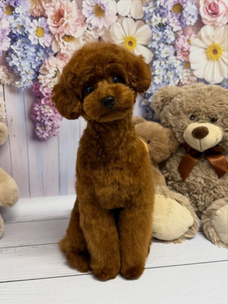 This cut keeps the fur uniform at 1.5 to 2 inches all over the body, with a round, fluffy head shape that mimics — you guessed it — a stuffed animal. The coat stays in that rich auburn or chocolate brown tone, which honestly looks unreal against a light-colored couch.