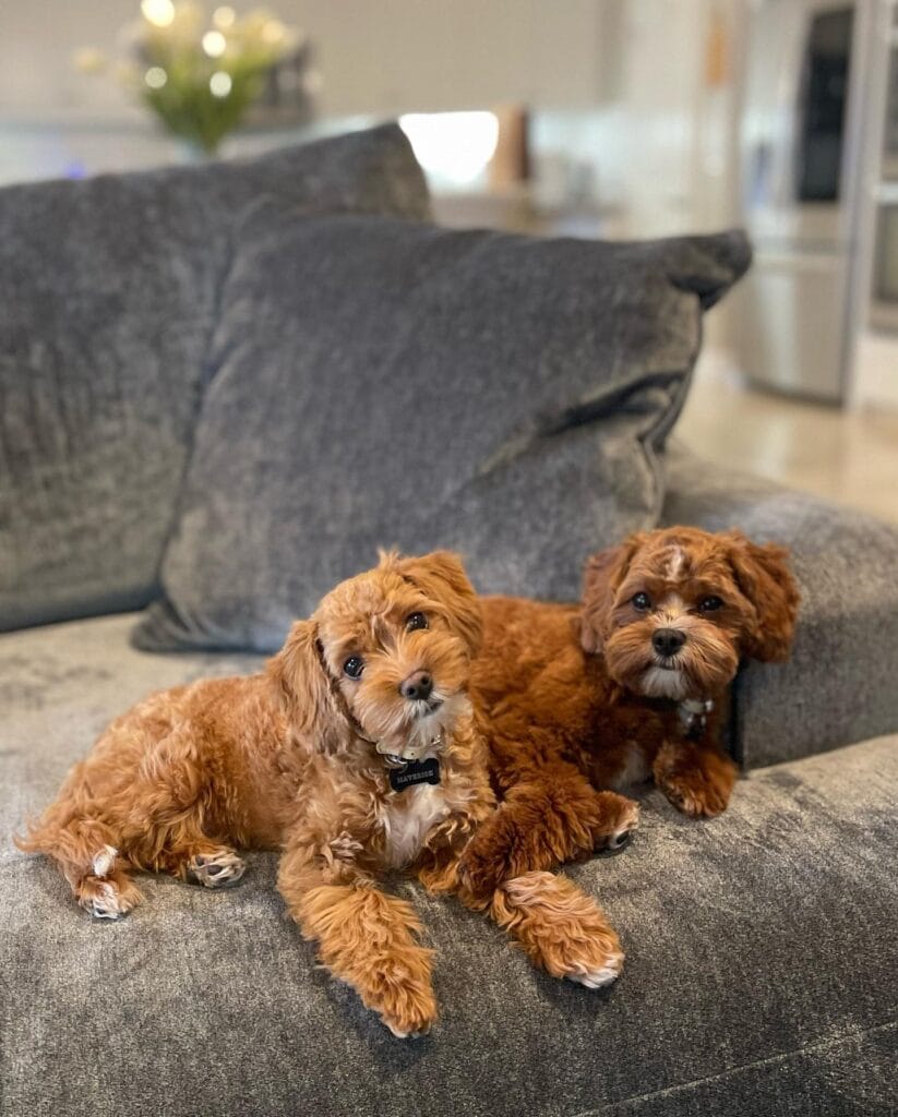 Look at these two. Seriously. If your golden retriever ever curled up next to a fluffy stuffed animal, you’d get the exact energy these cavapoos are giving on this gray sectional.