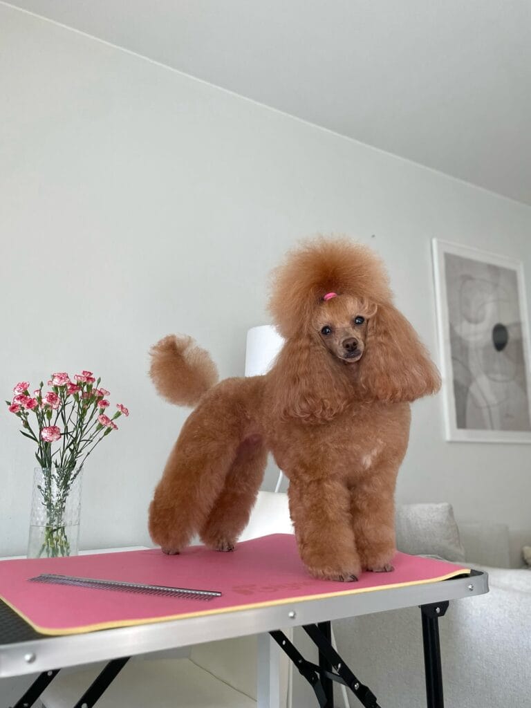 The Poodle Puff style keeps the body trimmed short while leaving a rounded, voluminous puff on top — think apricot cotton candy sitting right between the ears. That pink hair clip? Chef’s kiss. It keeps the topknot separated during grooming so the puff sets evenly.