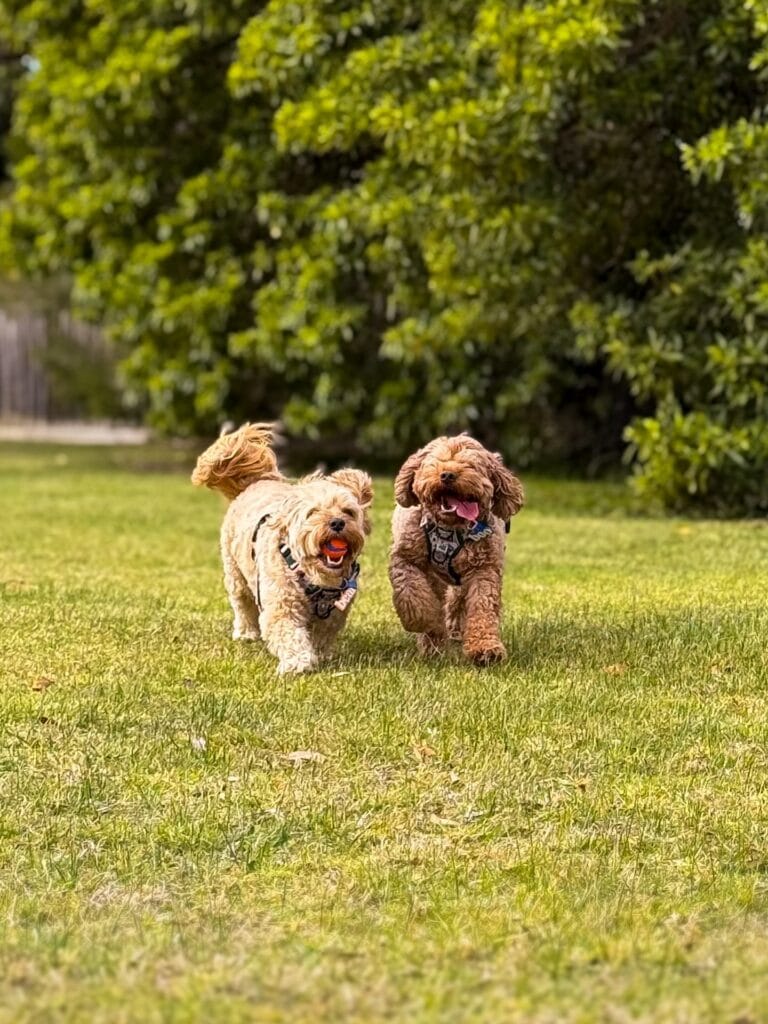 The lighter one carries a cream/sandy coat, the darker one a rich auburn-brown. Same cut, totally different vibe. That’s the magic here — this style works on any Cavapoo color.