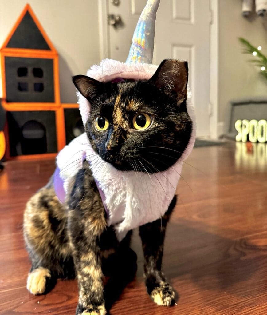 Okay, so you know how every October you’re scrambling to find something cute for your golden that doesn’t look like a sad, droopy cape? This tortoiseshell cat is literally wearing a lavender and white plush unicorn costume with a holographic iridescent horn and I cannot stop staring at it.