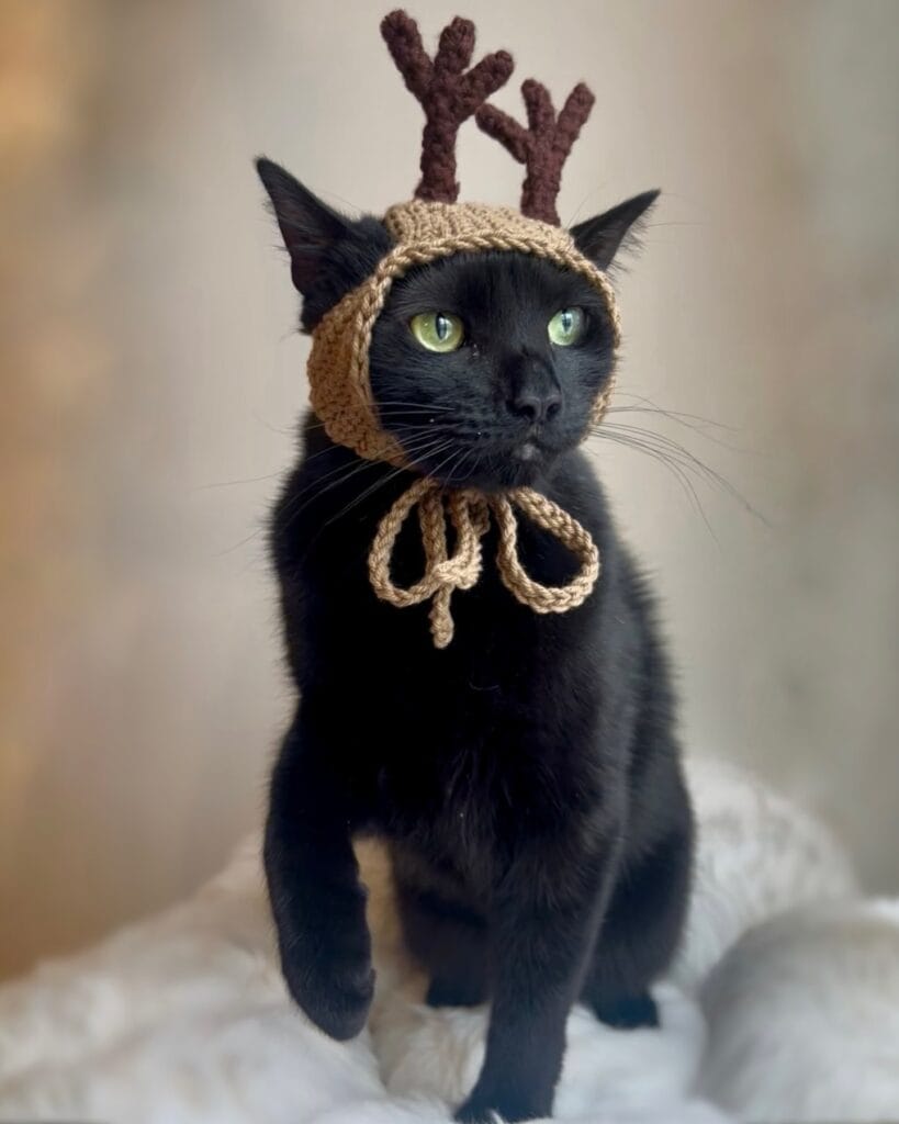 And if you’re shopping for one, search “crochet cat bonnet with antlers” on Etsy — sellers like MamaKatCrochet or PetBonnetShop list these for $12–$22.