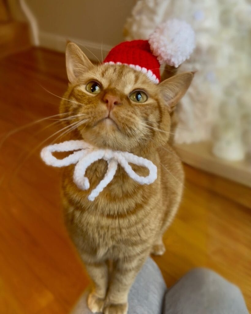 Okay so picture this — it’s Christmas morning, your golden is going absolutely feral over the wrapping paper, and meanwhile this orange tabby is just sitting there like a whole wrapped present himself. That’s exactly the energy this look gives.