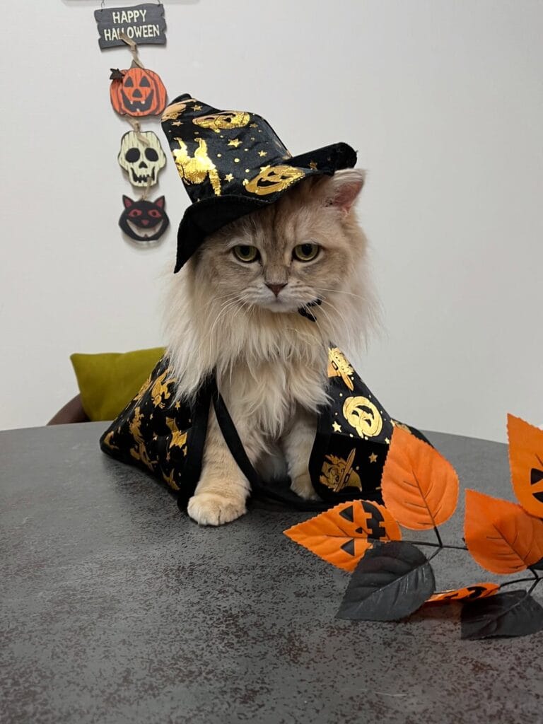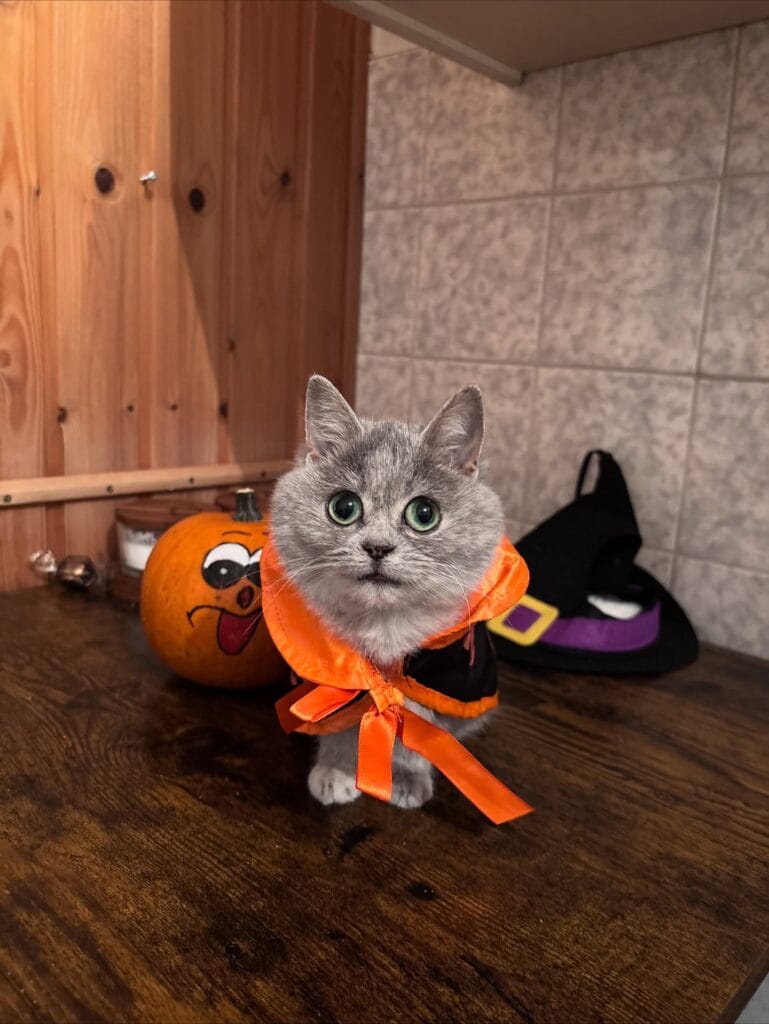 Okay so this one stopped me mid-scroll and I audibly said “no way” out loud. A gray kitten in a black and orange satin cape with a little bow tie — standing next to a painted pumpkin and a witch hat in the background. The whole setup gives Halloween party energy, and honestly? If your golden could pull off this vibe, you’d be posting it everywhere.