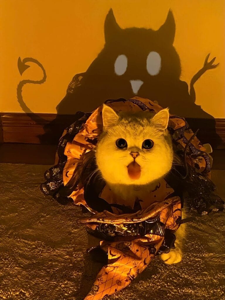 This is a Halloween ruffle dress in burnt orange and black with lace trim detailing and tiny bat and pumpkin prints all over the fabric. And the shadow on the wall behind this cat? That’s not an accident — that’s a projected monster silhouette that makes the whole setup look like a movie scene.