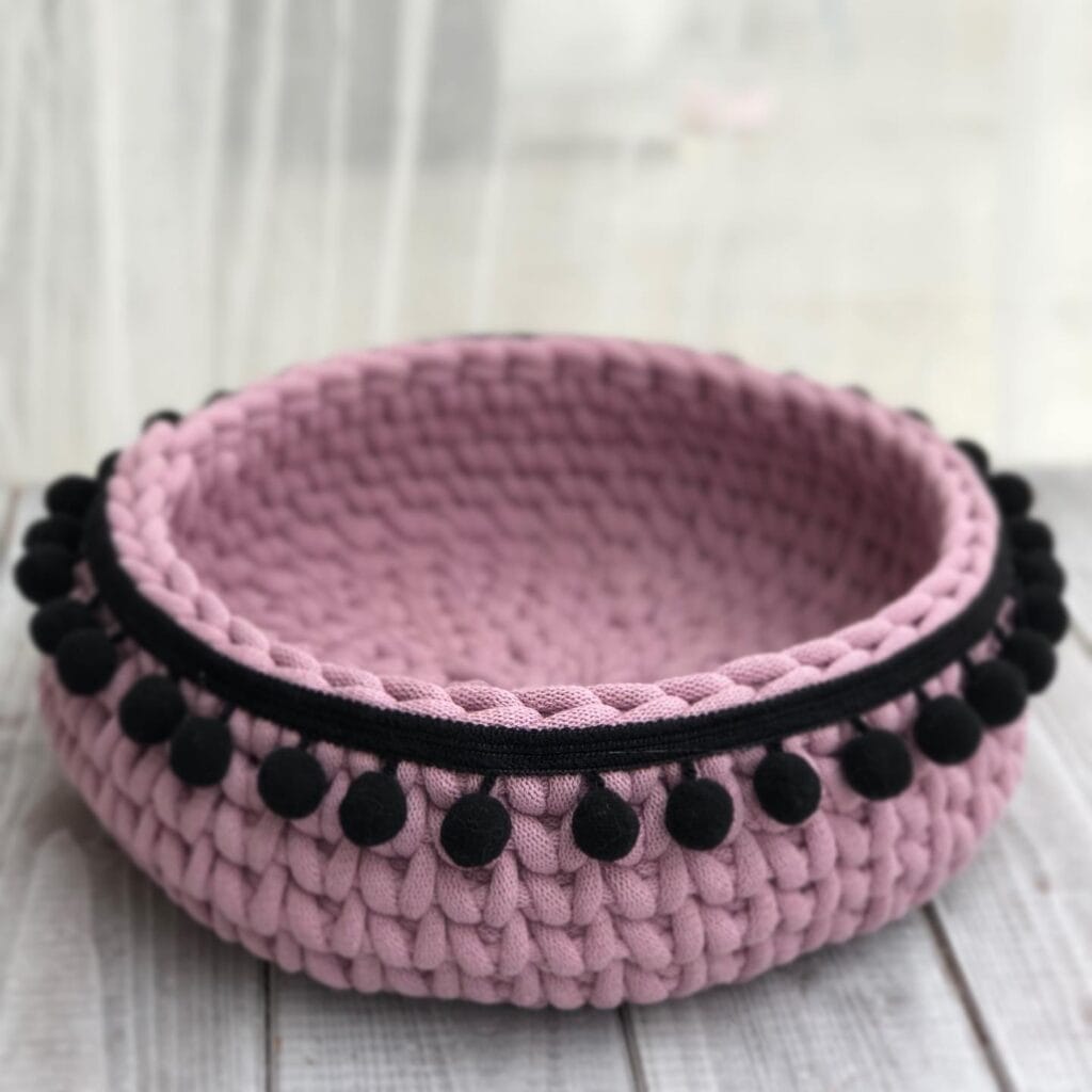 This dusty rose, hand-crocheted cat bed is giving everything — chunky texture, a black pom-pom trim ribbon running right around the middle, and that low, wide bowl shape that just looks like it belongs on a styled shelf or a linen-colored rug.